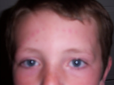 Okay, I must say that there is nothing I like more than having all my children play together. This evening while I was cooking dinner, the kids were in the family room playing and laughing and having a great time together. Well, just like most other times this occurs, something happens and turns everything upside down. Don't ask me what happened...but as they were playing they were taking turns swinging around a string of beads...don't ask me why. Well, the beads were in Libby's hand and she swung them around and wacked Zach right across the forehead. The nice fun playing, quickly changed to a sibling brawl! It absolutely amazes me how fast things can change around here. Well, after Zach got hit by the beads, everyone turned from being friendly to each other to going after each other. YUCK that is one of my least favorite things ever! When all was said and done everyone was sent to their rooms to cool down. Zach was really crying, and I am sure it hurt but sometimes he gets dramatic! Well, after dinner I looked over at him and saw that he has a stripe of circles going across his forehead! All, I could do was laugh...when I showed him in the mirror he laughed too. Check out these photos...